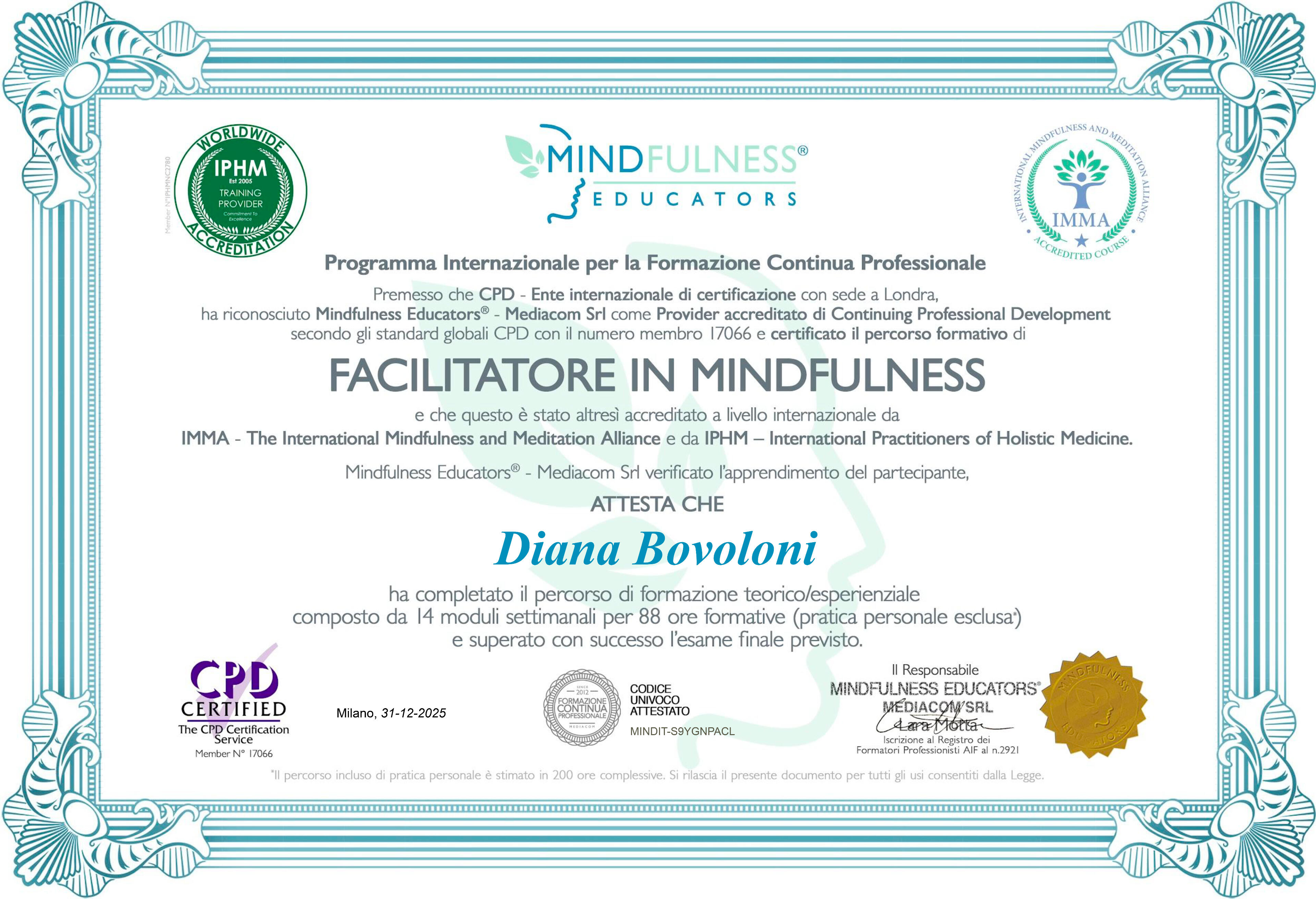 – integrazione nella vita quotidianaLa mia pratica è in costante aggiornamento e si fonda su studio, esperienza diretta e continuità.Uffialmente iscritta al Registro Globale dei Professionisti Certificati Mindfulness Educators®
