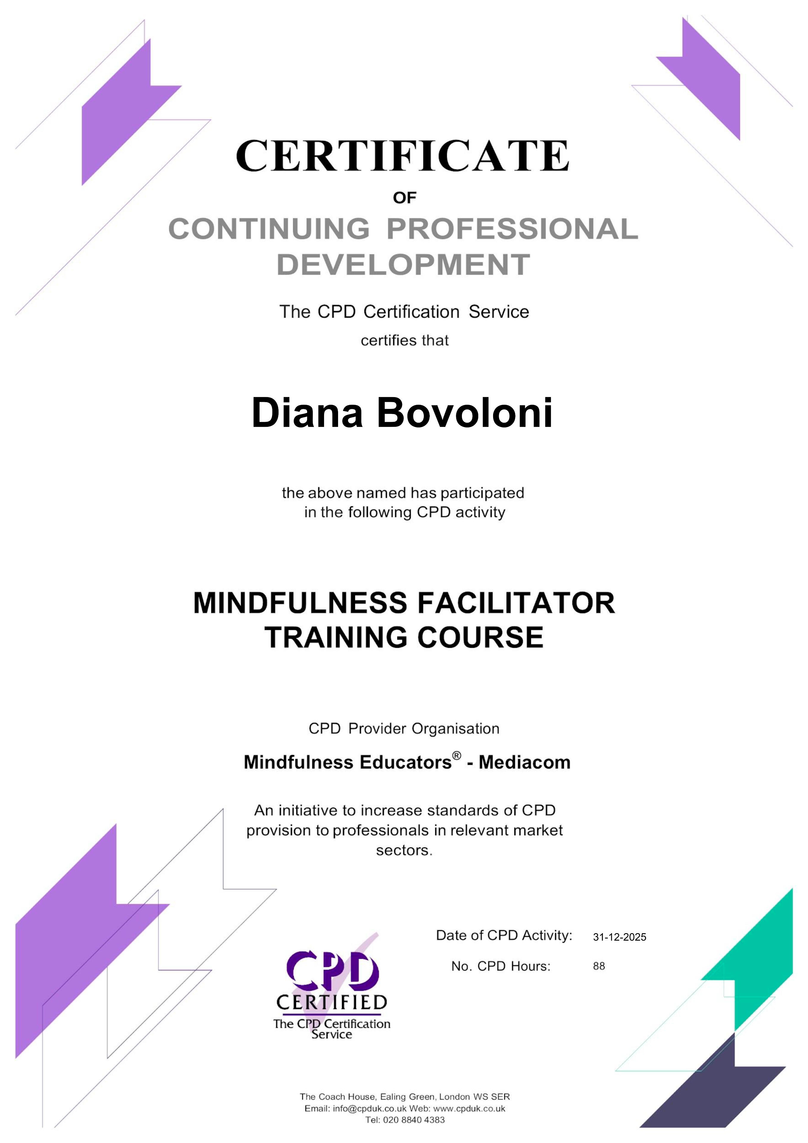 Sono mindfulness coach certificata ed ho completato la mia formazione presso Mindfulness Educators®.Il percorso formativo è ispirato ai principi dei protocolli MBSR (Mindfulness-Based Stress Reduction) e pone particolare attenzione a: